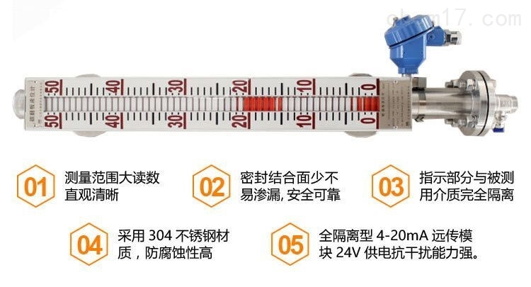 磁翻板液位計儀表可用于各種塔、罐、槽、球型容器和鍋爐等設備的介質液位檢測。該系列的液位計可以做到高密封,防泄漏和適用于高溫、高壓、耐腐蝕的場合。它彌補了玻璃板(管)液位計指示清晰度差、易破裂等缺陷,且全過程測量無盲區(qū),顯示清晰、測量范圍大。磁翻板液位計的零部件材料采用1Cr18Ni9Ti、316L、0Cr18Ni9Ti、1Cr18Ni9Ti襯PTFE(聚四氟乙烯)、PVC、PP等材料及進口元件,具有優(yōu)秀的可靠性和抗腐蝕性能。