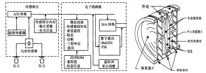 智能壓力變送器由智能傳感器和智能電子板兩部分組成,智能傳感器部分包括:電容式傳感器、測量膜片檢測電路、溫度傳感器和溫度補償電路等組成;智能電子板板部分包括:微電腦控制器及外圍電路組成,完成壓力信號到4~20mADC的轉換。