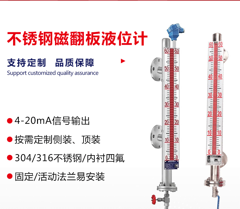 | 磁翻板液位計(jì)儀表可用于各種塔、罐、槽、球型容器和鍋爐等設(shè)備的介質(zhì)液位檢測(cè)。該系列的液位計(jì)可以做到高密封,防泄漏和適用于高溫、高壓、耐腐蝕的場(chǎng)合。它彌補(bǔ)了玻璃板(管)液位計(jì)指示清晰度差、易破裂等缺陷,且全過(guò)程測(cè)量無(wú)盲區(qū),顯示清晰、測(cè)量范圍大。磁翻板液位計(jì)的零部件材料采用1Cr18Ni9Ti、316L、0Cr18Ni9Ti、1Cr18Ni9Ti襯PTFE(聚四氟乙烯)、PVC、PP等材料及進(jìn)口元件,具有優(yōu)秀的可靠性和抗腐蝕性能 | |||||